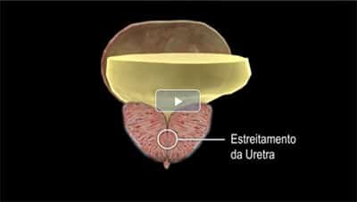 A uretra é comprimida pelo crescimento benigno da próstata, dificultando a saída da urina..